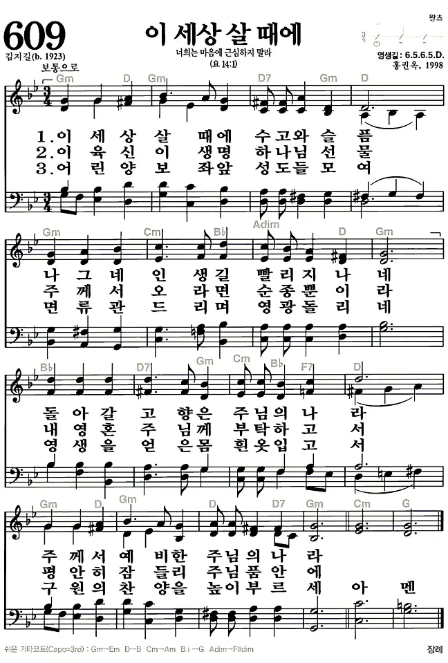 새찬송가 악보: 609장 이 세상 살때에(고화질/가사)
