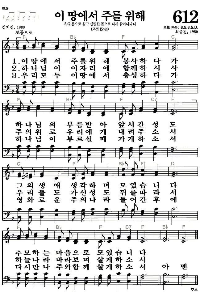 새찬송가 악보: 612장 이땅에서 주를 위해(고화질/가사)