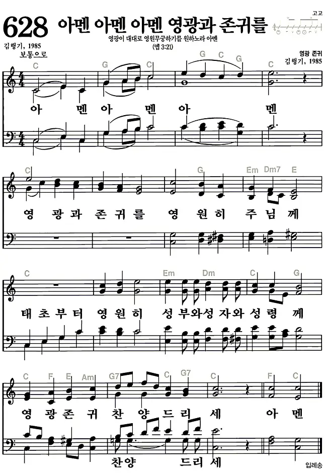 새찬송가 628장 아멘아멘아멘 영광과 존귀를의 고화질로 스캔된 새찬송가 악보입니다.