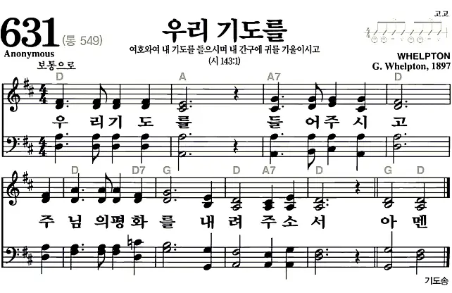 새찬송가 631장 우리 기도를의 고화질로 스캔된 새찬송가 악보입니다.