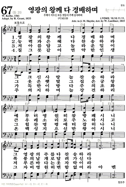 새찬송가 악보: 67장 영광의 왕께 다 경배하며(고화질/가사)