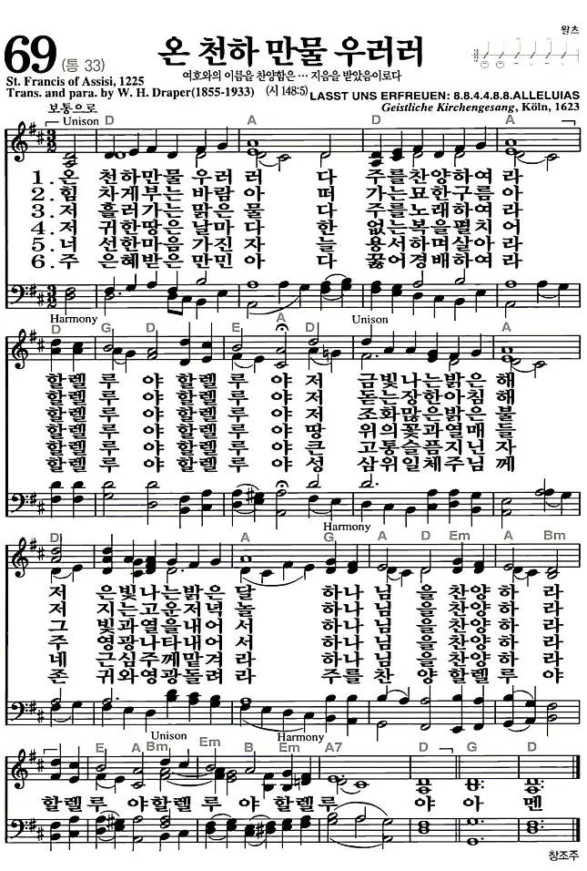 새찬송가 악보: 69장 온 천하 만물 우러러(고화질/가사)