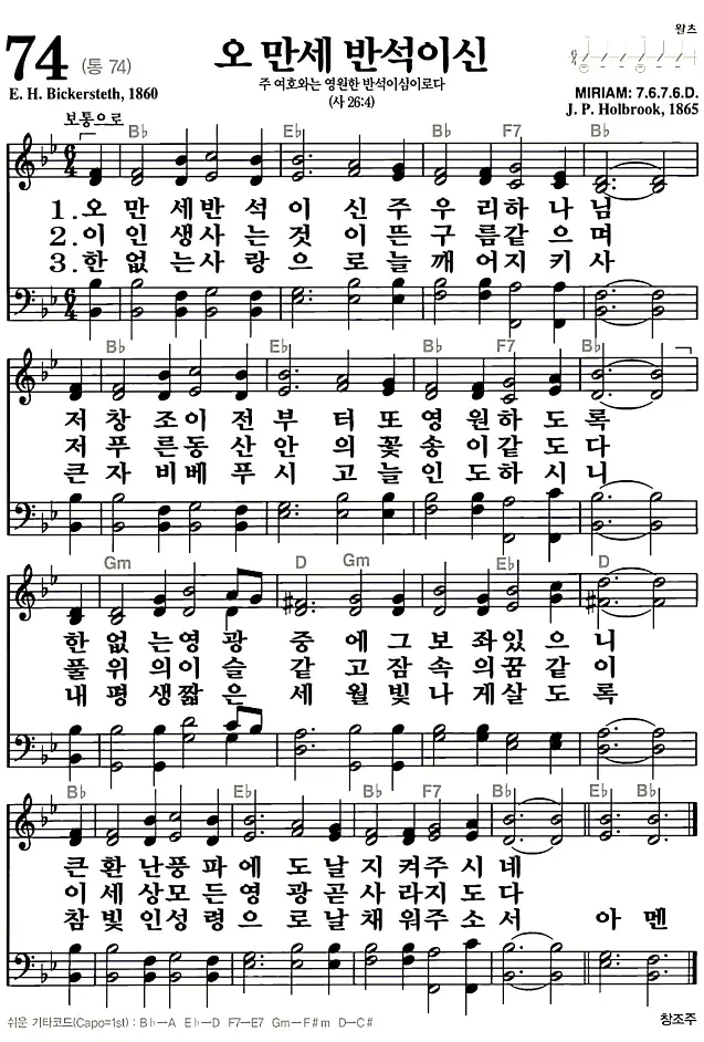 새찬송가 악보: 74장 오 만세 반석이신(고화질/가사)