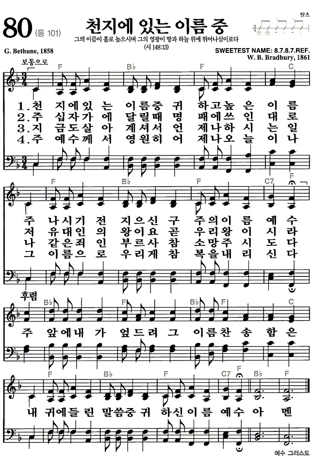 새찬송가 악보: 80장 천지에 있는 이름 중(고화질/가사)