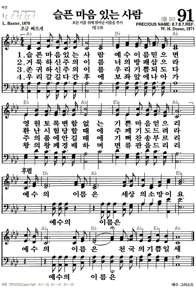 새찬송가 악보: 91장 슬픈 마음 있는 사람(고화질/가사)