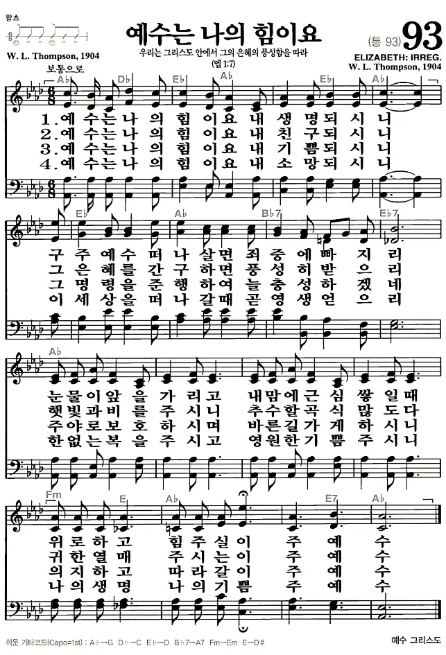 새찬송가 악보: 93장 예수는 나의 힘이요(고화질/가사)