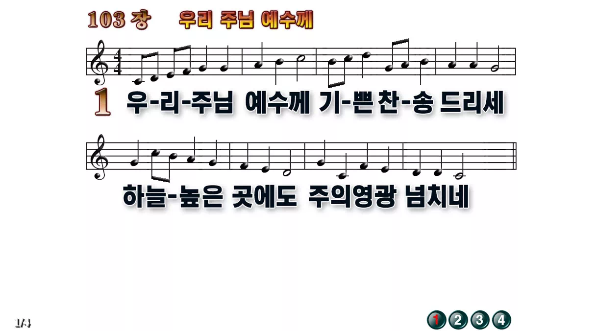 새찬송가 '103장 우리 주님 예수께'의 16:9 와이드버전으로 편집된 배경 없는 새찬송가 PPT악보입니다.