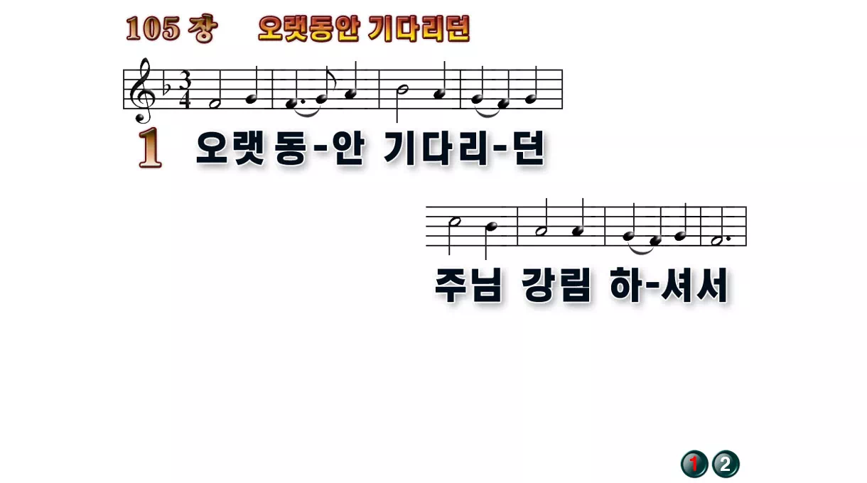 새찬송가 '105장 오랫동안 기다리던'의 16:9 와이드버전으로 편집된 배경 없는 새찬송가 PPT악보입니다.