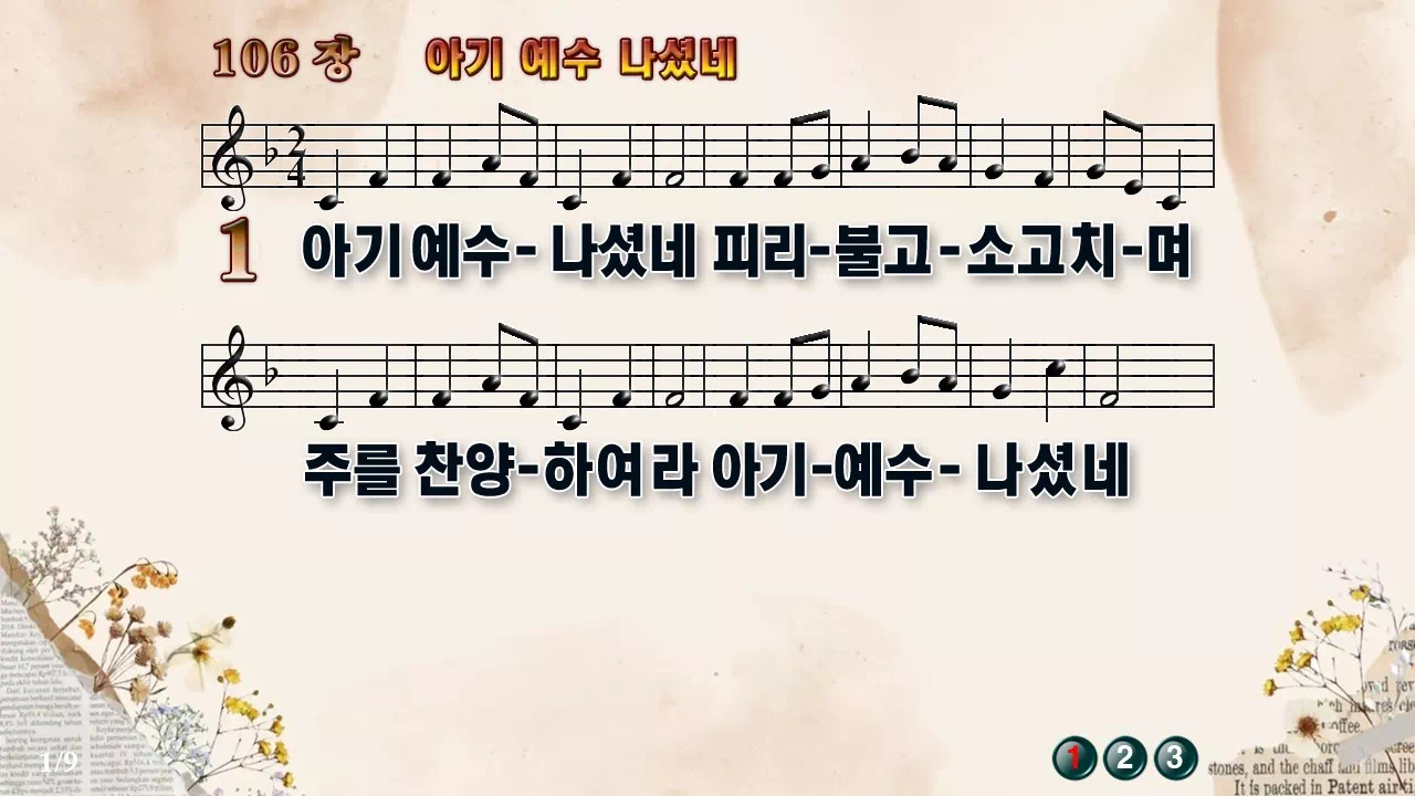 새찬송가 '106장 아기 예수 나셨네'의 16:9 와이드버전으로 편집된 새찬송가 PPT악보입니다.