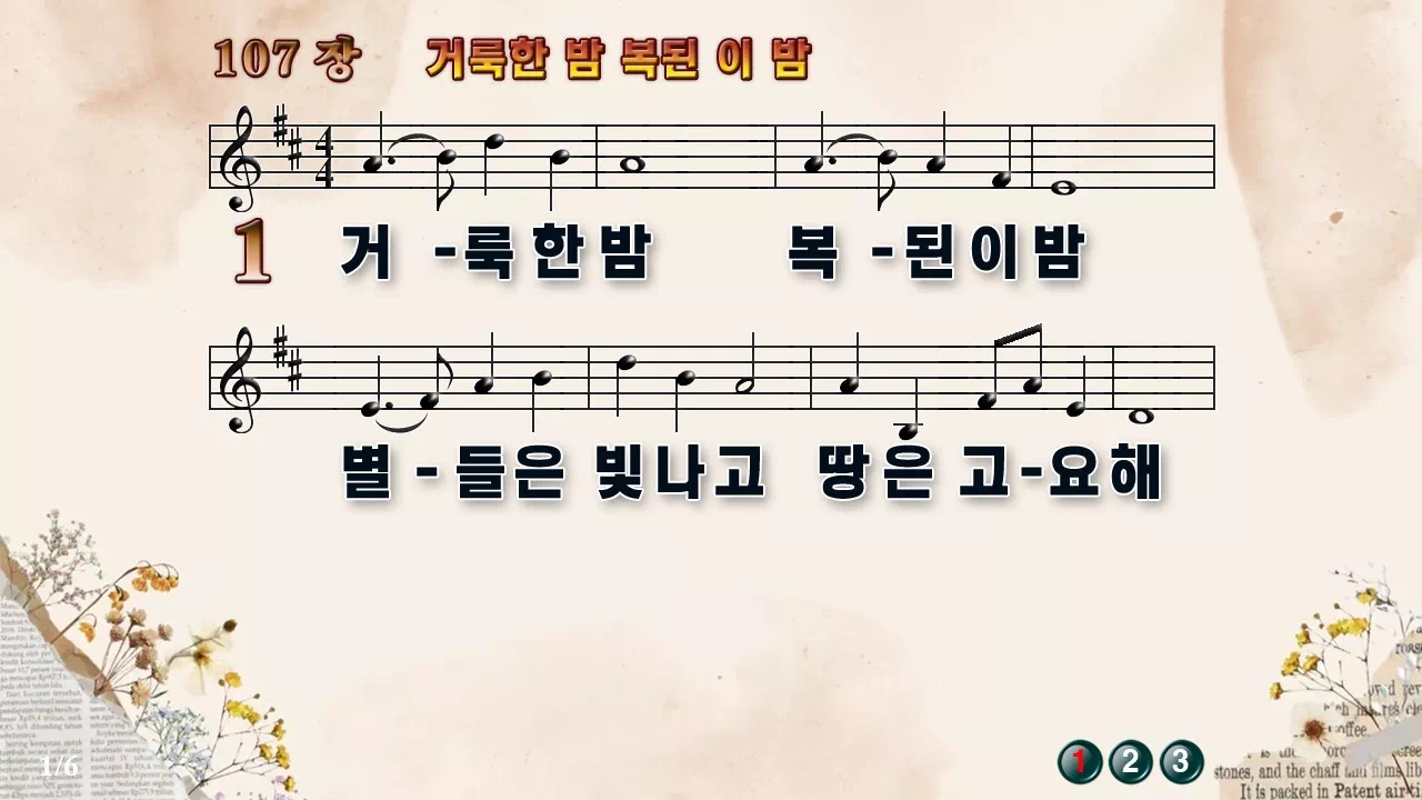 새찬송가 '107장 거룩한 밤 복된 이 밤'의 16:9 와이드버전으로 편집된 새찬송가 PPT악보입니다.