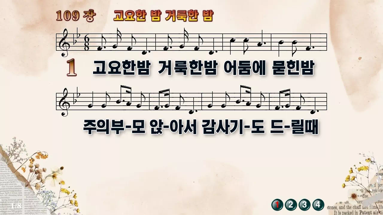 새찬송가 '109장 고요한 밤 거룩한 밤'의 16:9 와이드버전으로 편집된 새찬송가 PPT악보입니다.