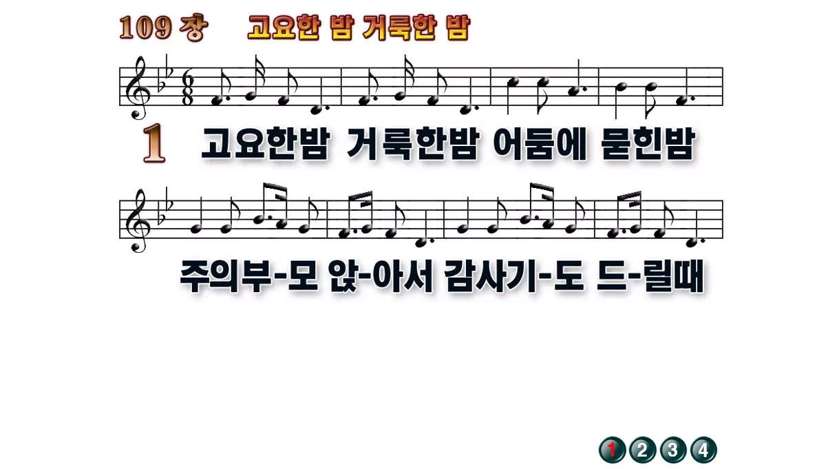 새찬송가 '109장 고요한 밤 거룩한 밤'의 16:9 와이드버전으로 편집된 배경 없는 새찬송가 PPT악보입니다.
