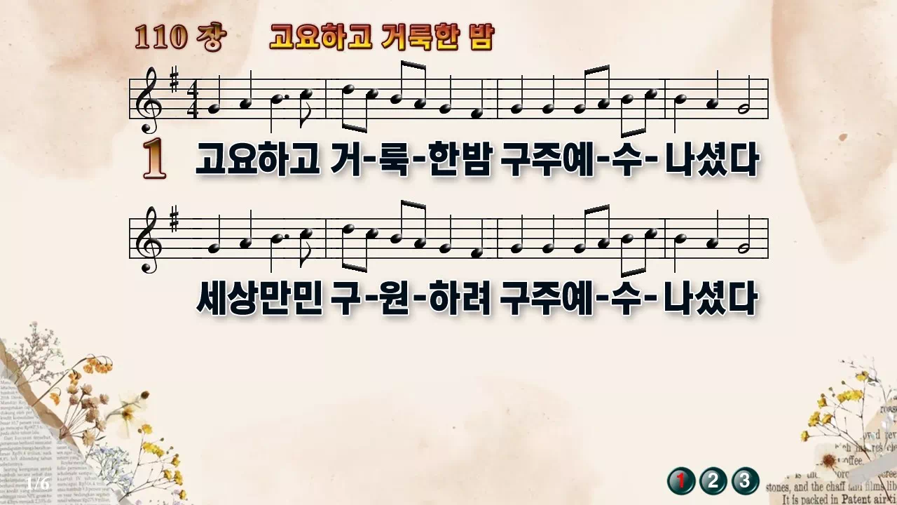 새찬송가 '110장 고요하고 거룩한 밤'의 16:9 와이드버전으로 편집된 새찬송가 PPT악보입니다.