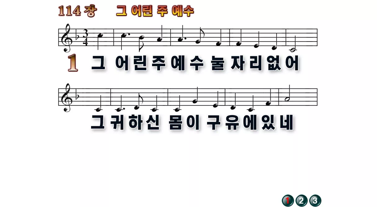 새찬송가 '114장 그 어린 주 예수'의 16:9 와이드버전으로 편집된 배경 없는 새찬송가 PPT악보입니다.