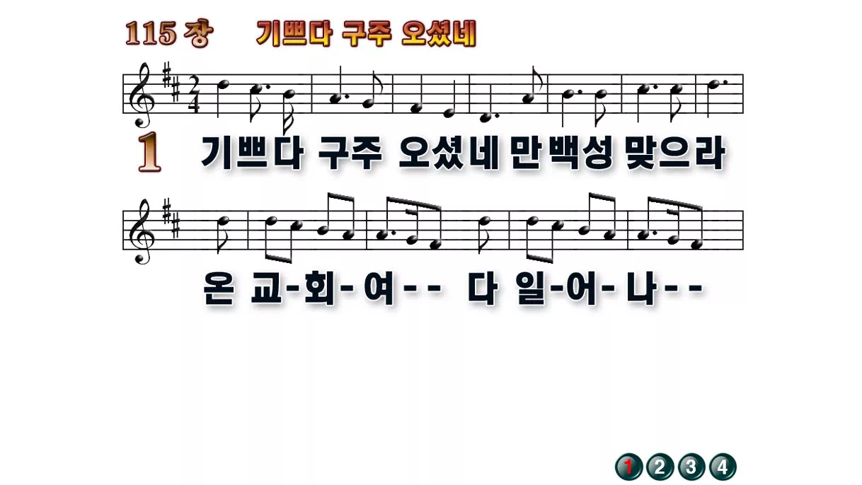 새찬송가 '115장 기쁘다 구주 오셨네'의 16:9 와이드버전으로 편집된 배경 없는 새찬송가 PPT악보입니다.