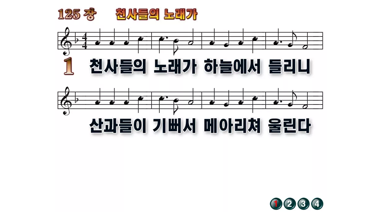 새찬송가 '125장 천사들의 노래가'의 16:9 와이드버전으로 편집된 배경 없는 새찬송가 PPT악보입니다.