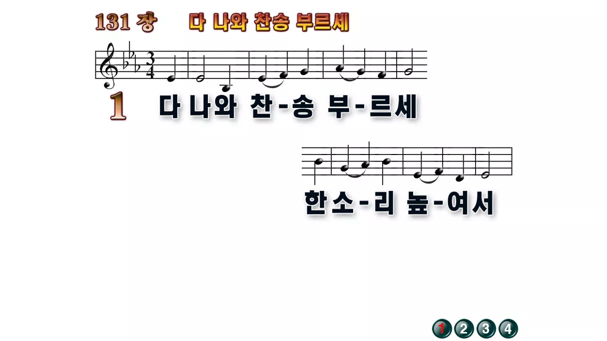 새찬송가 '131장 다 나와 찬송 부르세'의 16:9 와이드버전으로 편집된 배경 없는 새찬송가 PPT악보입니다.