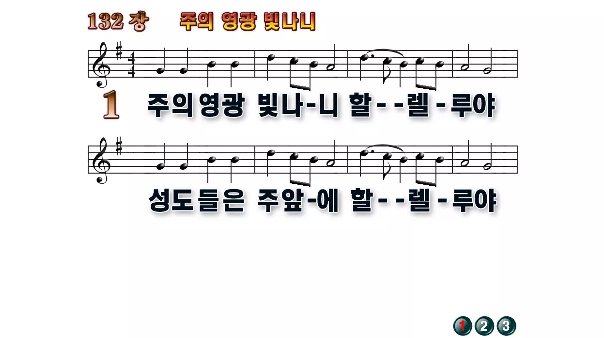 새찬송가 '132장 주의 영광 빛나니'의 16:9 와이드버전으로 편집된 배경 없는 새찬송가 PPT악보입니다.
