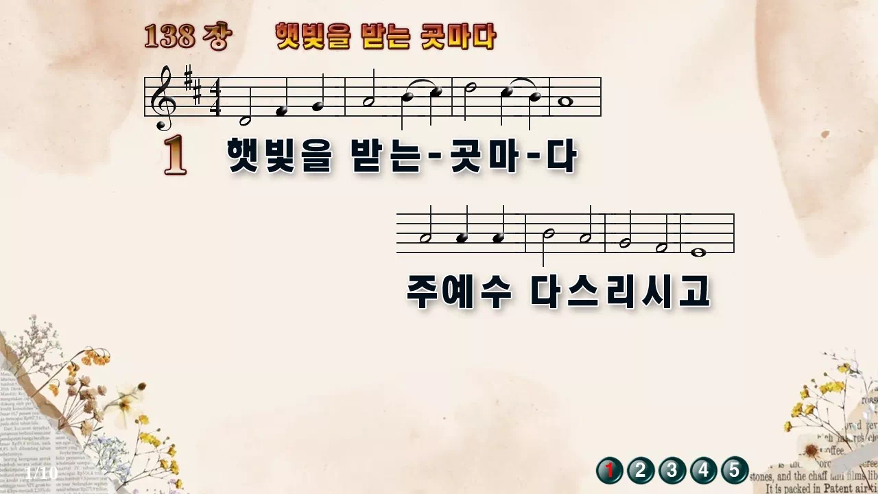 새찬송가 '138장 햇빛을 받는 곳마다'의 16:9 와이드버전으로 편집된 새찬송가 PPT악보입니다.