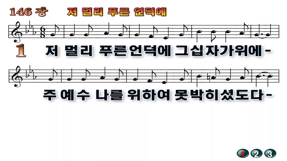 새찬송가 '146장 저 멀리 푸른 언덕에'의 16:9 와이드버전으로 편집된 배경 없는 새찬송가 PPT악보입니다.