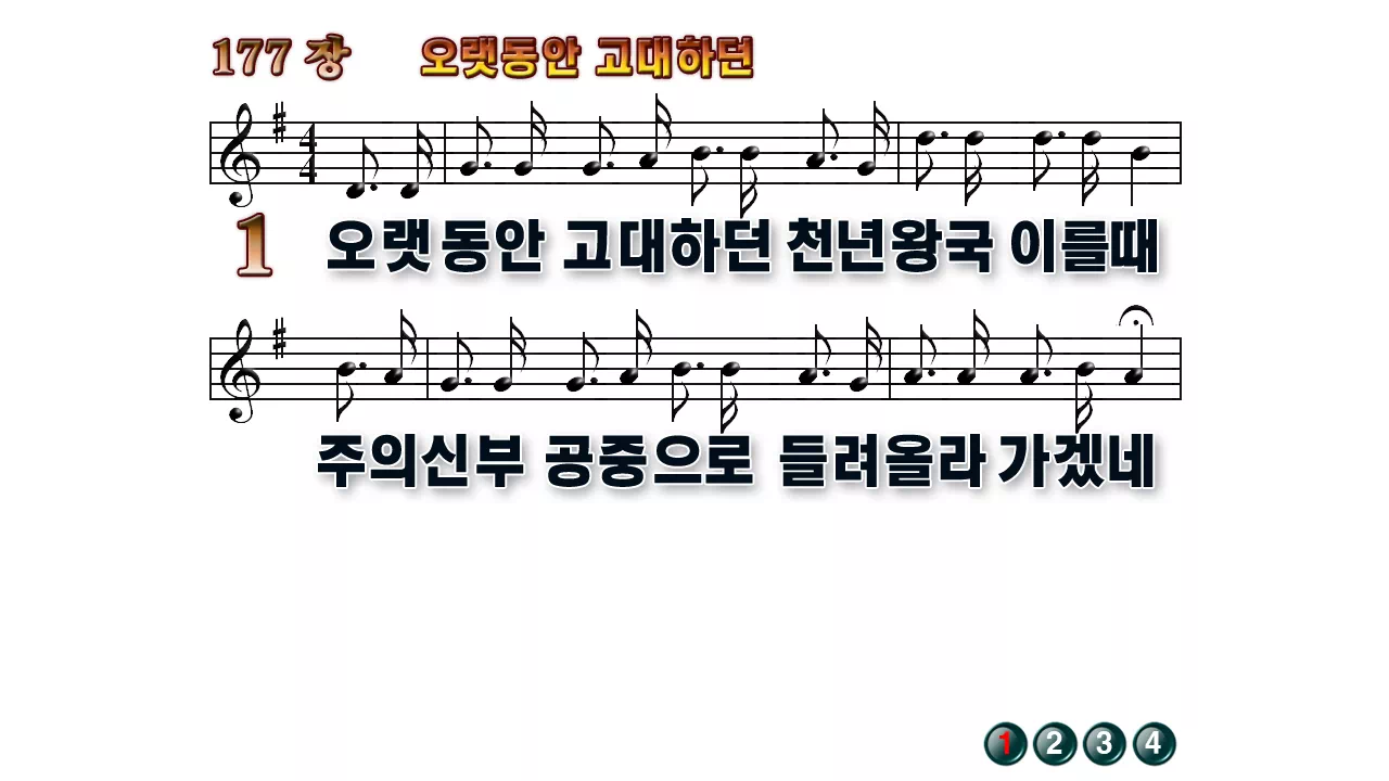 새찬송가 '177장 오랫동안 고대하던'의 16:9 와이드버전으로 편집된 배경 없는 새찬송가 PPT악보입니다.