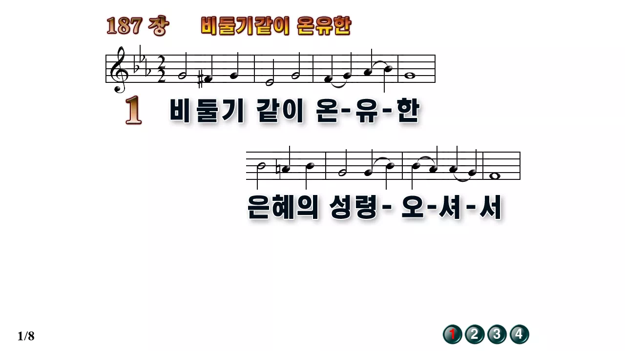새찬송가 '187장 비둘기 같이 온유한'의 16:9 와이드버전으로 편집된 배경 없는 새찬송가 PPT악보입니다.