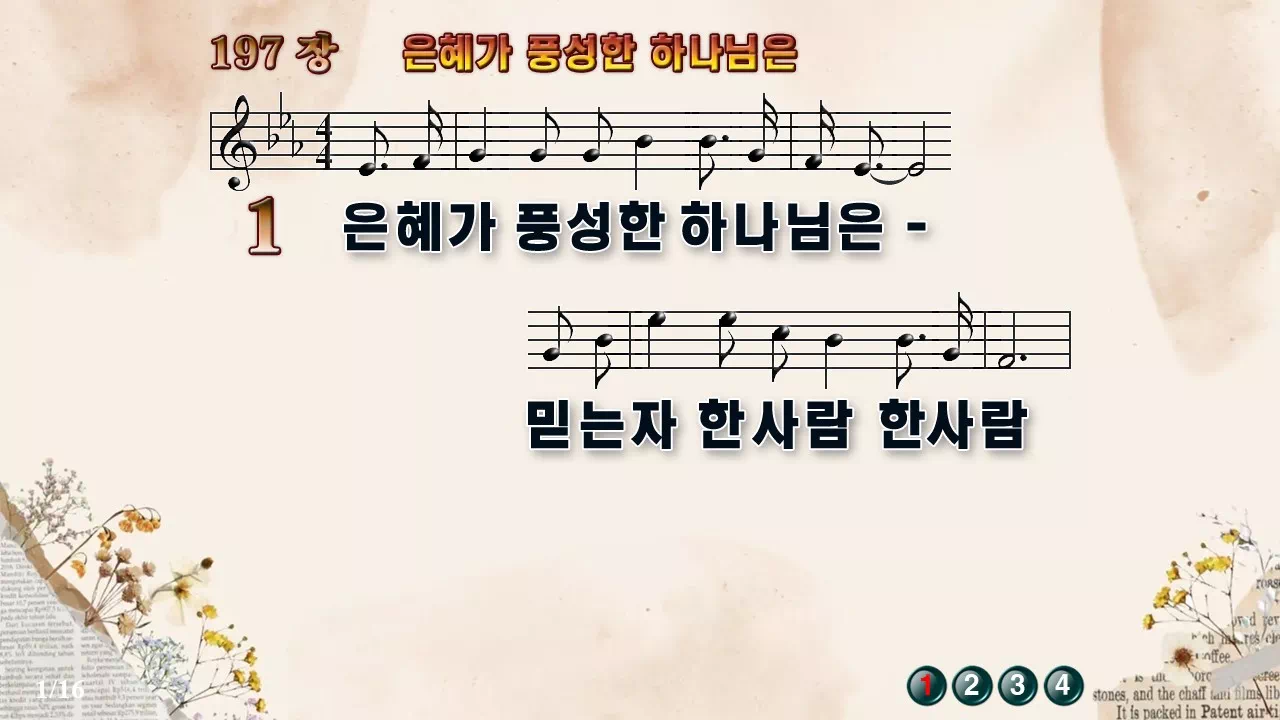 새찬송가 '197장 은혜가 풍성한 하나님은'의 16:9 와이드버전으로 편집된 새찬송가 PPT악보입니다.