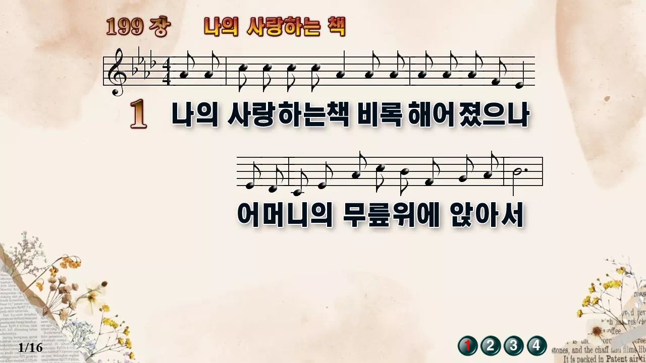 새찬송가 '199장 나의 사랑하는 책'의 16:9 와이드버전으로 편집된 새찬송가 PPT악보입니다.