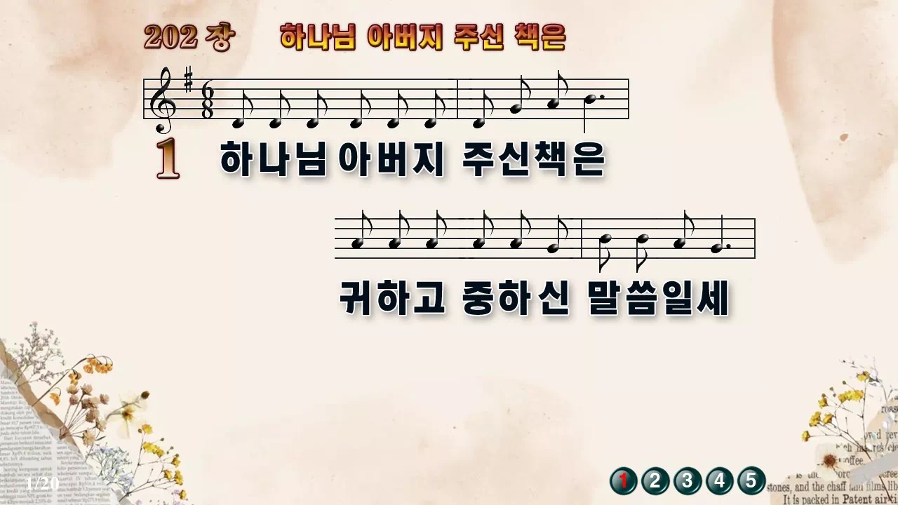 새찬송가 '202장 하나님 아버지 주신 책은'의 16:9 와이드버전으로 편집된 새찬송가 PPT악보입니다.