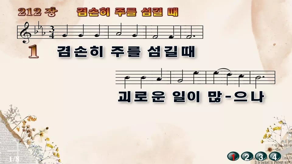 새찬송가 '212장 겸손히 주를 섬길 때'의 16:9 와이드버전으로 편집된 새찬송가 PPT악보입니다.