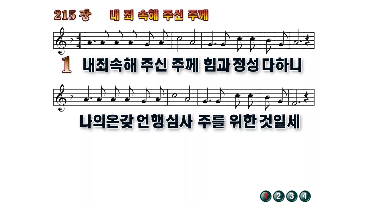 새찬송가 '215장 내 죄 속해 주신 주께'의 16:9 와이드버전으로 편집된 배경 없는 새찬송가 PPT악보입니다.