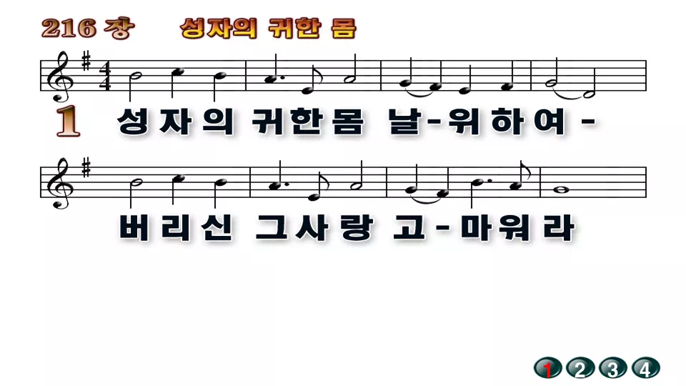새찬송가 '216장 성자의 귀한 몸'의 16:9 와이드버전으로 편집된 배경 없는 새찬송가 PPT악보입니다.