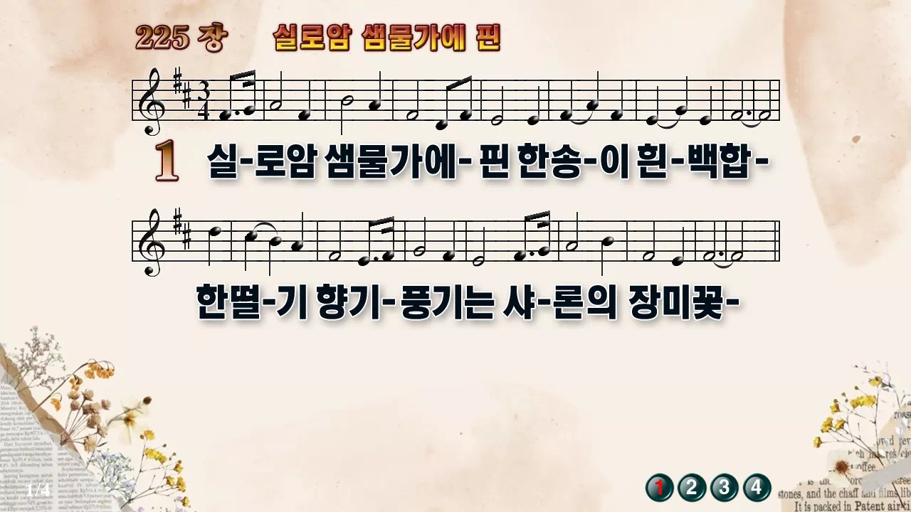 새찬송가 '225장 실로암 샘물가에 핀'의 16:9 와이드버전으로 편집된 새찬송가 PPT악보입니다.