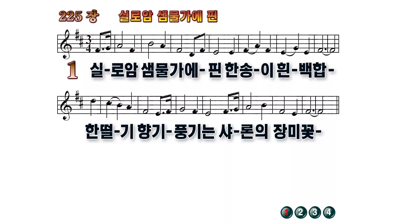 새찬송가 '225장 실로암 샘물가에 핀'의 16:9 와이드버전으로 편집된 배경 없는 새찬송가 PPT악보입니다.
