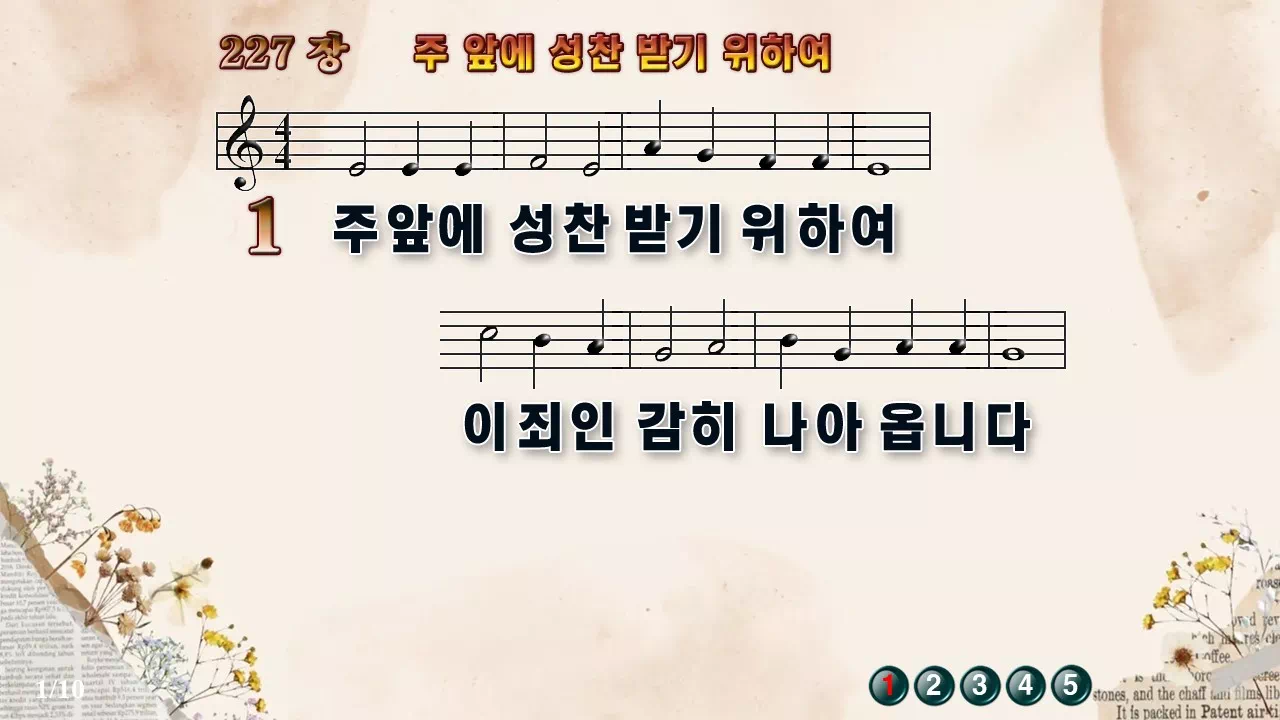 새찬송가 '227장 주 앞에 성찬 받기 위하여'의 16:9 와이드버전으로 편집된 새찬송가 PPT악보입니다.