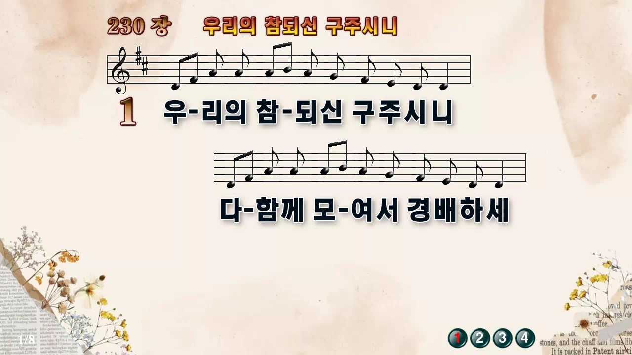 새찬송가 '230장 우리의 참되신 구주시니'의 16:9 와이드버전으로 편집된 새찬송가 PPT악보입니다.