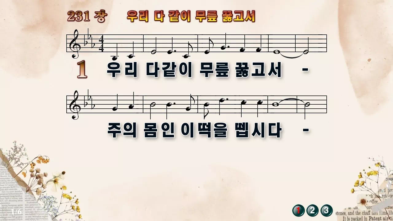 새찬송가 '231장 우리 다 같이 무릎 꿇고서'의 16:9 와이드버전으로 편집된 새찬송가 PPT악보입니다.