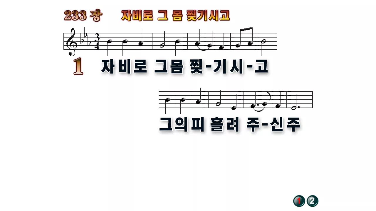 새찬송가 '233장 자비로 그 몸 찢기시고'의 16:9 와이드버전으로 편집된 배경 없는 새찬송가 PPT악보입니다.
