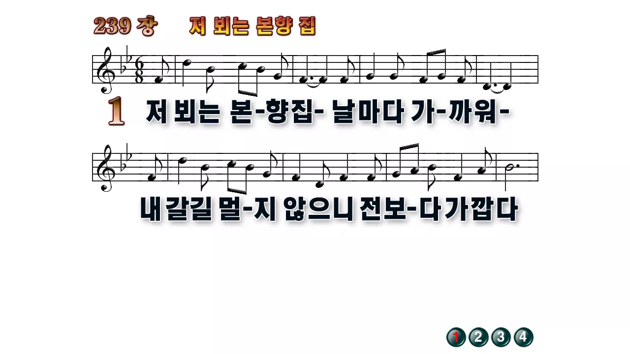 새찬송가 '239장 저 뵈는 본향 집'의 16:9 와이드버전으로 편집된 배경 없는 새찬송가 PPT악보입니다.