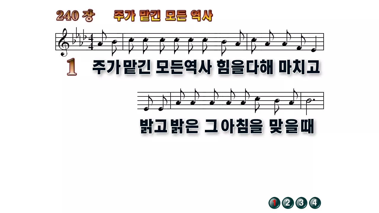 새찬송가 '240장 주가 맡긴 모든 역사'의 16:9 와이드버전으로 편집된 배경 없는 새찬송가 PPT악보입니다.