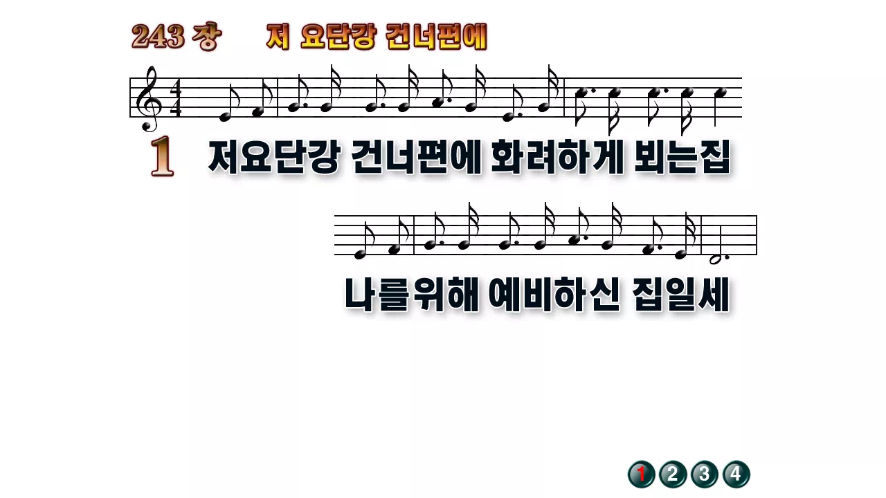 새찬송가 '243장 저 요단강 건너편에'의 16:9 와이드버전으로 편집된 배경 없는 새찬송가 PPT악보입니다.