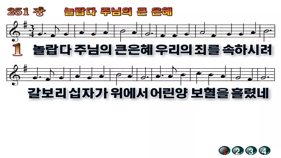 새찬송가 '251장 놀랍다 주님의 큰 은혜'의 16:9 와이드버전으로 편집된 배경 없는 새찬송가 PPT악보입니다.