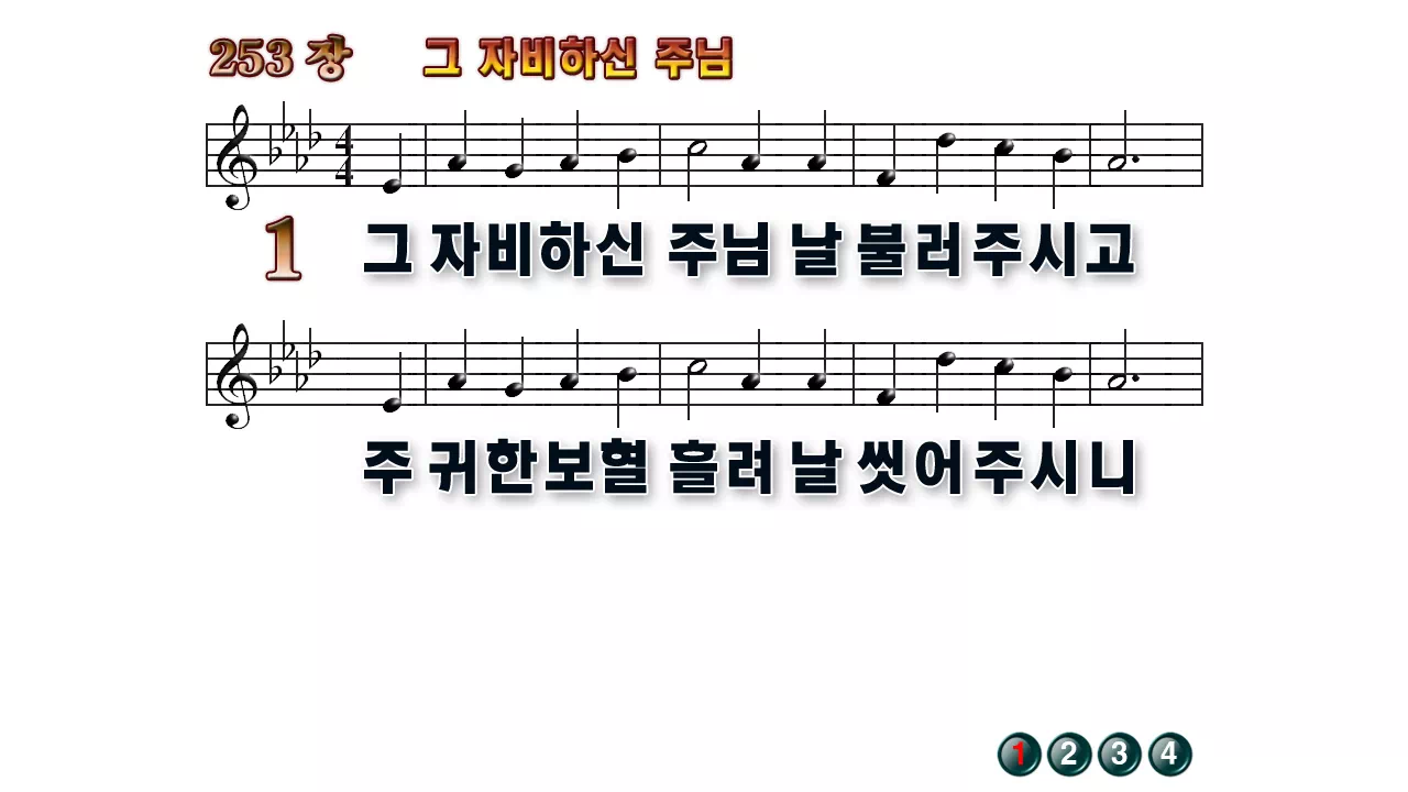 새찬송가 '253장 그 자비하신 주님'의 16:9 와이드버전으로 편집된 배경 없는 새찬송가 PPT악보입니다.