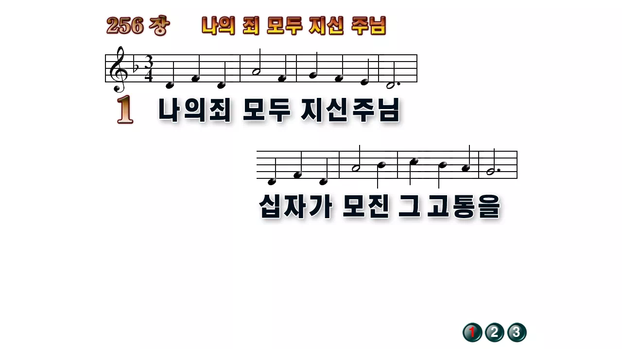 새찬송가 '256장 나의 죄 모두 지신 주님'의 16:9 와이드버전으로 편집된 배경 없는 새찬송가 PPT악보입니다.