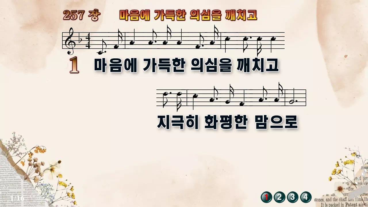 새찬송가 '257장 마음에 가득한 의심을 깨치고'의 16:9 와이드버전으로 편집된 새찬송가 PPT악보입니다.