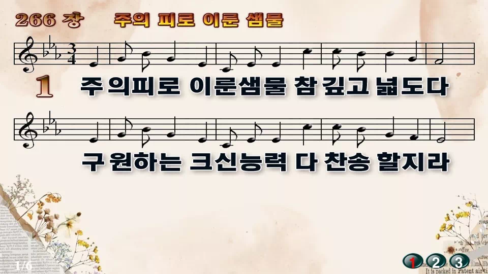 새찬송가 '266장 주의 피로 이룬 샘물'의 16:9 와이드버전으로 편집된 새찬송가 PPT악보입니다.