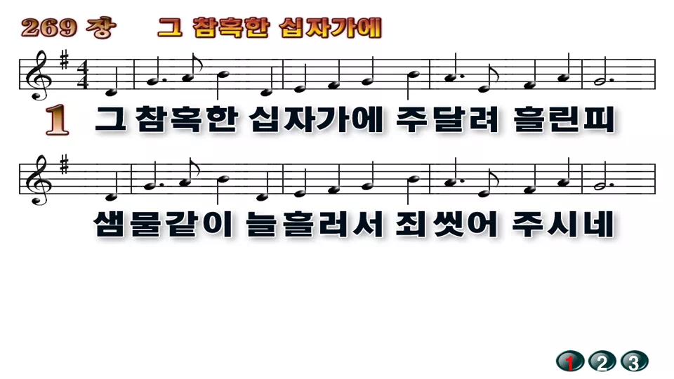 새찬송가 '269장 그 참혹한 십자가에'의 16:9 와이드버전으로 편집된 배경 없는 새찬송가 PPT악보입니다.