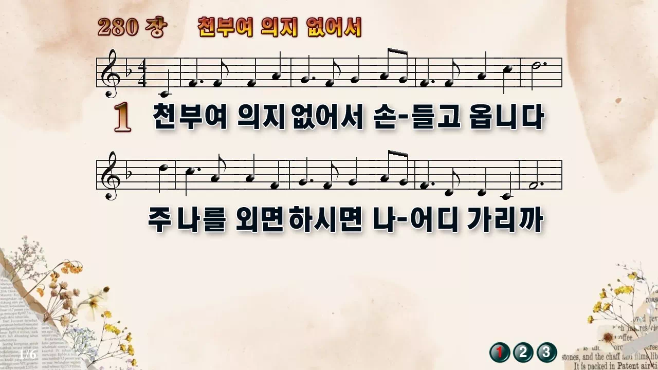 새찬송가 '280장 천부여 의지 없어서'의 16:9 와이드버전으로 편집된 새찬송가 PPT악보입니다.