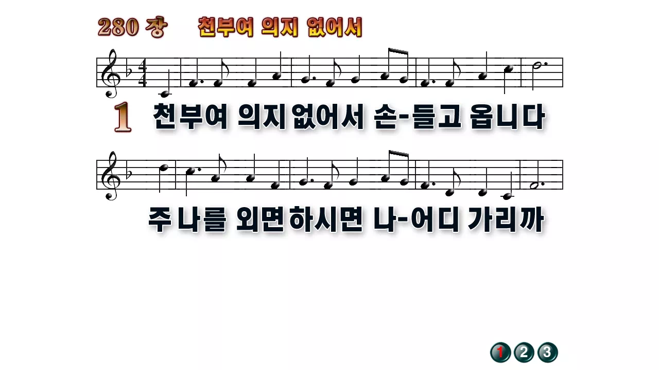 새찬송가 '280장 천부여 의지 없어서'의 16:9 와이드버전으로 편집된 배경 없는 새찬송가 PPT악보입니다.