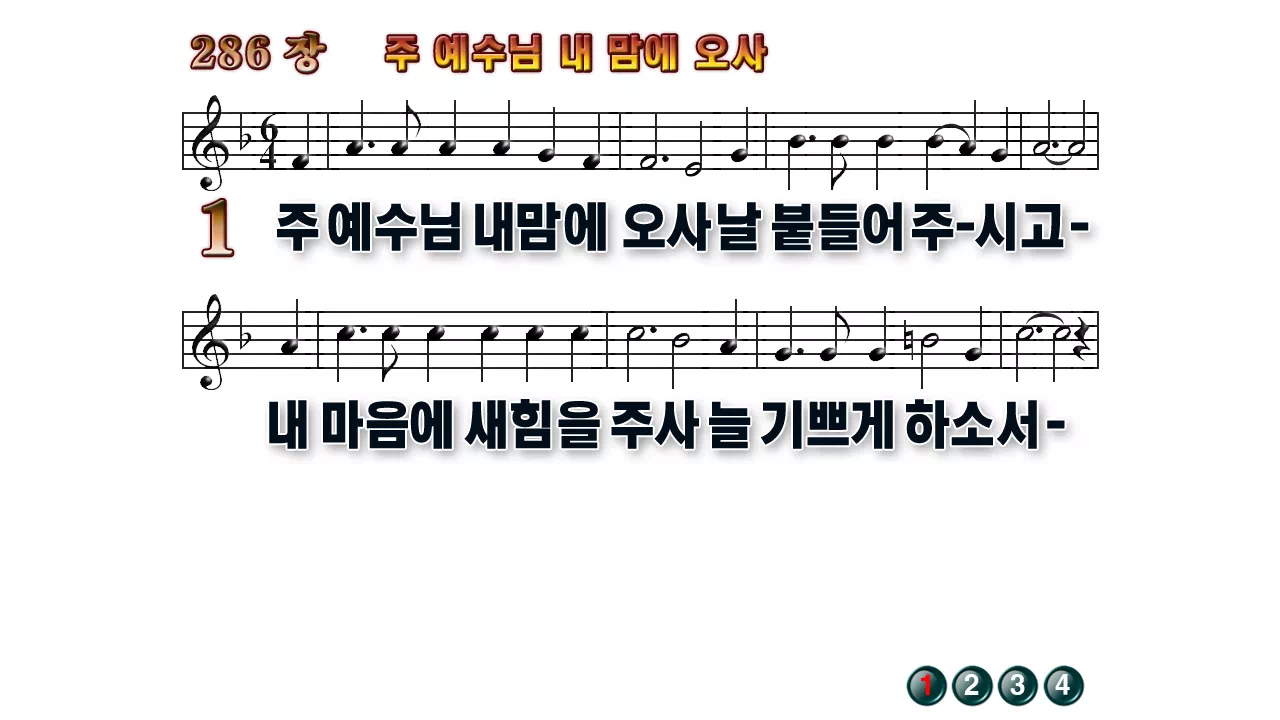 새찬송가 '286장 주 예수님 내 맘에 오사'의 16:9 와이드버전으로 편집된 배경 없는 새찬송가 PPT악보입니다.